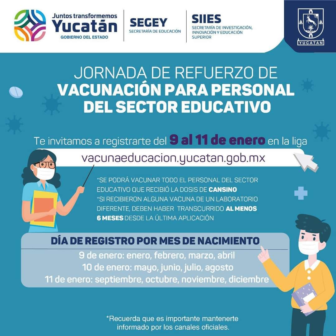 Según informó Liborio Vidal Aguilar, titular de la SEGEY, el Gobierno del estado, a través de la Secretaría de Educación de Yucatán (SEGEY), activará el sitio vacunaeducacion.yucatan.gob.mx, donde a partir del domingo 9 de enero las y los docentes y el personal educativo activo podrán registrarse de acuerdo con su fecha de nacimiento: el 9 de enero quienes nacieron entre enero y abril; el día 10, quienes nacieron entre mayo y agosto, y el día 11 de enero, los nacidos entre septiembre y diciembre.