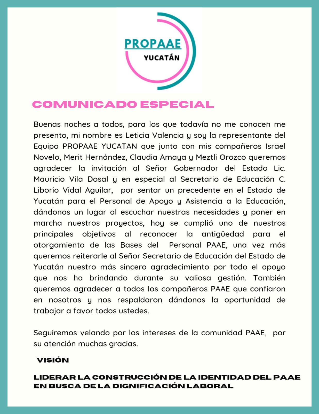 "Debemos reconocer a las nuevas autoridades educativas la oportunidad que nos brinda de ser escuchados, sumando esfuerzos para iniciar un precedente para abrir nuevos caminos y realizar cambios fundamentales a favor del personal PAAE, construyendo de esta forma, proyectos que proporcionen un servicio de calidad a la educación".